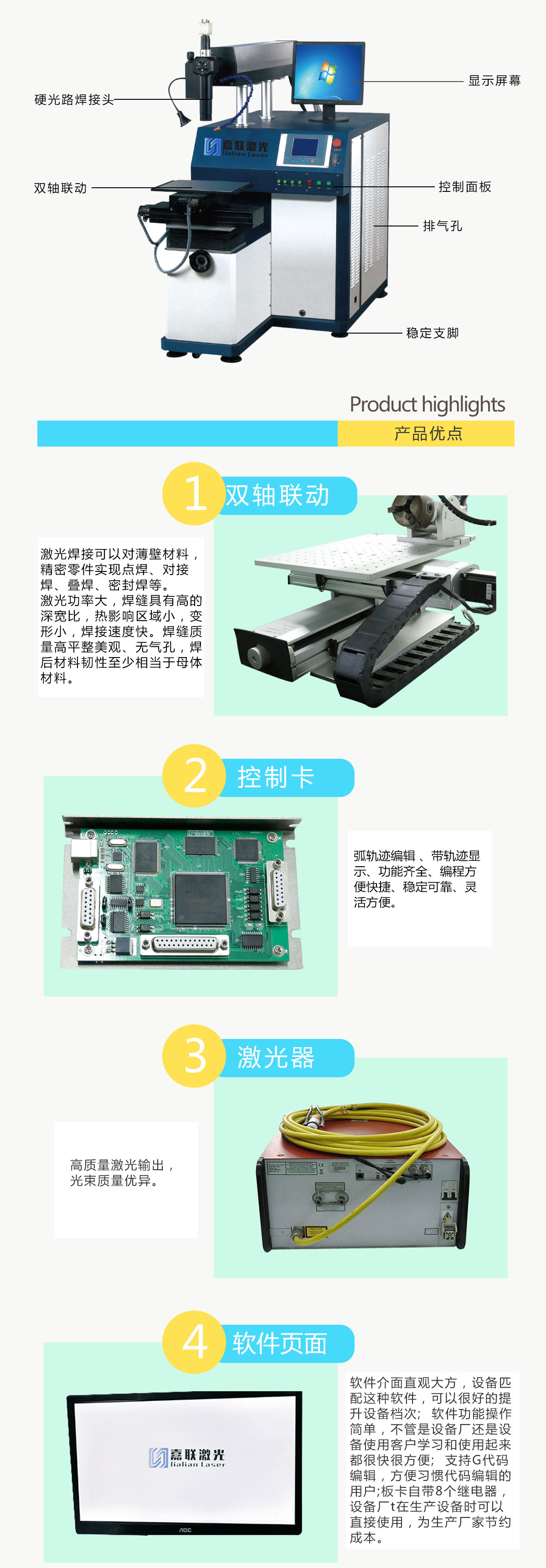 焊接機及其配套旋轉夾具、采用CNC控制系統(tǒng),可焊接相貫線,漸開線,曲線,點整列,等任意軌跡。該設備為我公司針對精密焊接行業(yè)專門研發(fā),擁有高倍放大系統(tǒng)、深受廣大用戶好評。新款的設備采用恒壓源電源方式,有觸摸屏和按鍵式可以選擇,該電源系統(tǒng)波形可調,光路系統(tǒng)通過優(yōu)化,光路穩(wěn)定,能量恒定。外部循環(huán)水采用日本進口壓縮機,整機采用制冷水箱,外型美觀,效果。是應用激光器產生的波長為1064nm的脈沖激光經過擴束、反射、聚焦后輻射加工件表面,表面熱量通過熱傳導向內部擴散,通過數(shù)字化精確控制激光脈沖的寬度、能量、峰值功率和重復頻率等參數(shù),使工件熔化,形成特定的熔池,從而實現(xiàn)對被加工件的激光焊接,完成傳統(tǒng)工藝無法實現(xiàn)的精密焊接。