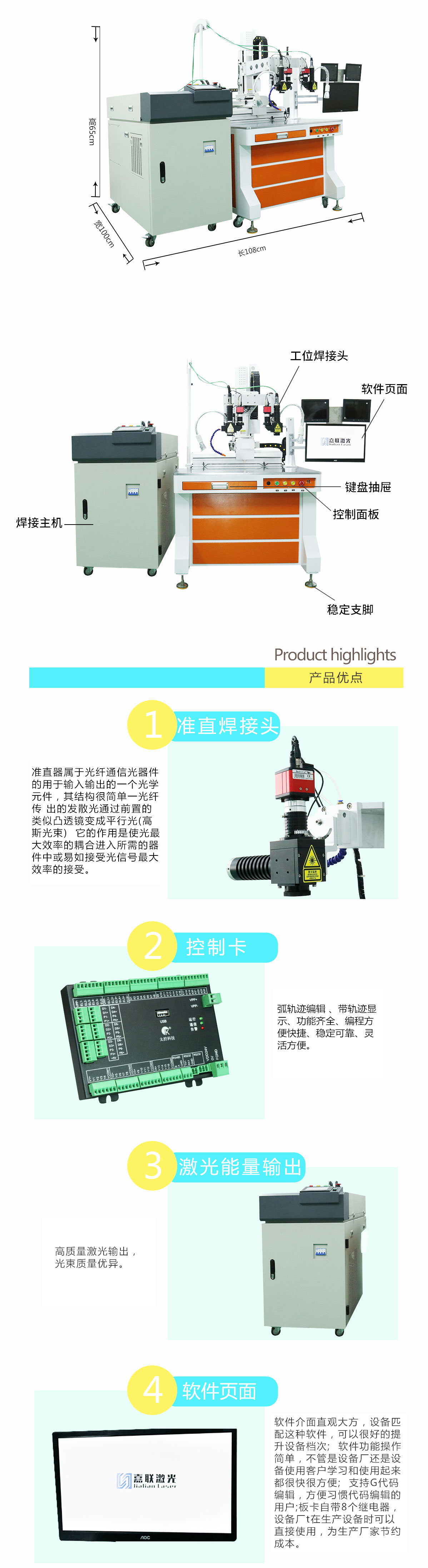 雙頭聯(lián)動激光接機(jī)將光分成兩路,可同時焊接兩個很近的焊點(diǎn),可大大提升焊接效率,并能保焊接的準(zhǔn)確度。雙頭激光焊接可以對薄壁材料,精密零件實(shí)現(xiàn)點(diǎn)焊,對接焊,疊焊,密封焊等;激光功率大,焊縫具有高的深度比,熱影響區(qū)域小,變形小,無氣孔,焊后材料韌性至少相當(dāng)于母體材料;人體化設(shè)計(jì),液晶屏顯示,集中按鍵化操作更簡單;四維滾珠絲杠工作臺,采用進(jìn)口伺服控制系統(tǒng),可選旋轉(zhuǎn)工作臺,可以實(shí)現(xiàn)點(diǎn)焊,